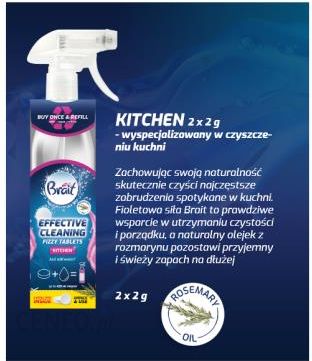 Brait Spray Kitchen + Tabletki 2x2g do Czyszczenia z Butelką Wielorazowego UżytkuTworzą roztwór idealny do czyszczenia powierzchni. Nie wyrzucaj butelki, tylko użyj jej wielokrotnie stosując różne warianty produktu. Uwaga! Działa drażniąco na oczy.Pojemność: 2x2g + Butelka SprayOferta dotyczy produktu KITCHEN!!!”
