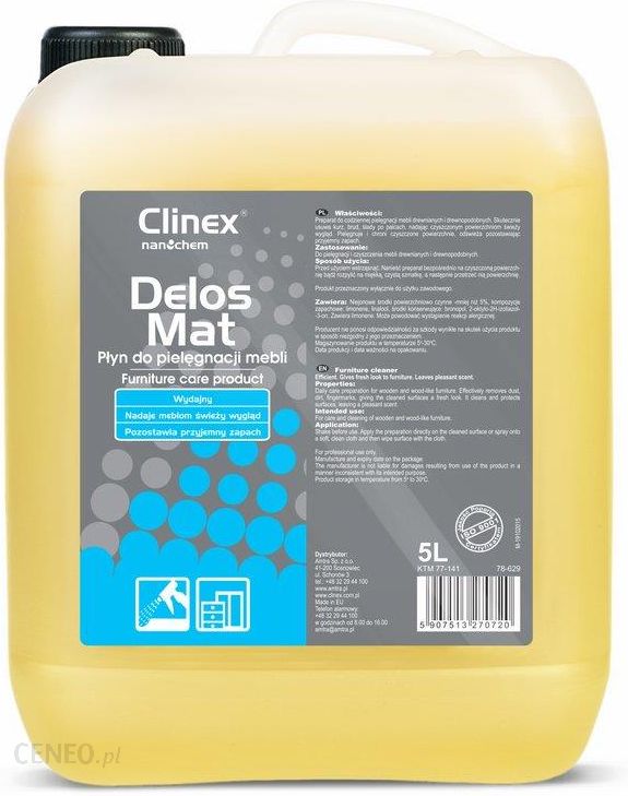 DELOS MAT 5 l Płyn do codziennej pielęgnacji mebli – bez połysku CLINEX DELOS MAT to gotowy do użycia płyn do codziennej pielęgnacji mebli drewnianych, drewnopodobnych oraz elementów laminowanych. Doskonale usuwa kurz, brud, przebarwienia, tłuste ślady. Posiada właściwości antystatyczne, opóźnia proces osiadania kurzu. Pielęgnuje i chroni czyszczone powierzchnie, odświeża pozostawiając przyjemny zapach. Produkt profesjonalny- niedostępny w marketach i drogeriach stosowany w wielu hotelach, firmach sprzątających SPOSÓB UŻYCIA Produkt przeznaczony do pielęgnacji powierzchni meblowych. Dozowanie: Przed użyciem wstrząsnąć. Nanieść produkt bezpośrednio na czyszczoną powierzchnię lub rozpylić na miękką, czystą szmatkę, a następnie przetrzeć nią powierzchnię. Oferowane opakowanie: kanister 5l Kolor: słomkowy Zapach: przyjemny pH: 8.0 Kategorie na allegro: ponadpodłogowe GORĄCO ZAPRASZAMY DO ZAKUPU !!
