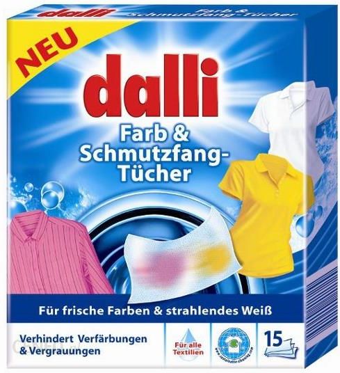 DALLI Chusteczki wyłapujące kolory i brud 15 szt DE- skuteczna ochrona przed zafarbowaniem tkanin- łatwe i wygodne w stosowaniu- praktyczne rozwiązanie- 15 sztuk w opakowaniu- produkt niemieckiNiemieckie chusteczki do prania Dalli to innowacyjny sposób na bezpieczne pranie kolorowych tkanin.Chusteczki skutecznie chronią przed farbowaniem, ich innowacyjna struktura przyciąga drobinki barwnika i zanieczyszczeń, dzięki czemu chronią kolory Twoich ubrań.Regularne stosowanie chusteczek marki Dalli zapewnia maksymalną efektywność wyłapywania koloru.Dalli Farb & Schmutzfang-Tucher nie tylko wyłapują barwnik, ale również wspomagają usuwanie brudu i zanieczyszczeń.Chusteczki skutecznie chronią włókna przed przenikaniem kolorów między tkaninami.W opakowaniu znajduje się 15 chusteczek o innowacyjnej strukturze zapewniającej maksymalną absorbcję barwnika.Sposób użycia:1. Do bębna z praniem wrzuć jedną chusteczkę (przy załadunku maksymalnie do 4,5 kg, przy większym załadunku należy stosować 2 chusteczki).2. Dodaj detergent.3. Po użyciu wyjmij chusteczkę z bębna i wyrzuć do kosza.Informacje dodatkowe:Ilość: 15 sztuk