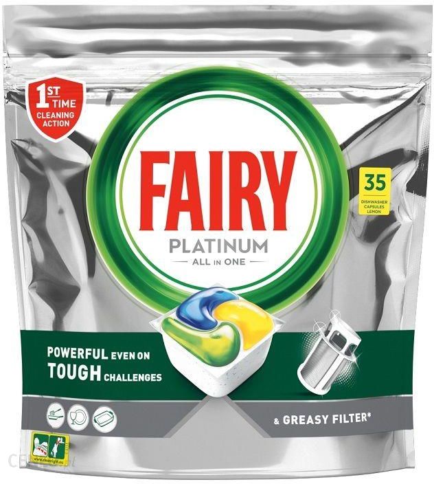 Fairy Platinum All In One Lemon – tabletki do zmywarkiTabletki do zmywarki All In One Fairy Platinum działają już przy 1. myciu i usuwają nawet trudne zabrudzenia, pozostawiając naczynia czyste i lśniące. Dzięki sile działania tabletek do zmywarki Fairy Platinum możesz bez obaw przygotowywać wszelkie posiłki, wiedząc, że poradzą sobie nawet z tłustym filtrem, a naczynia i zmywarka będą czyste i pachnące świeżością. Tabletki do zmywarki Fairy to połączenie płynu i proszku w jednej wydajnej kapsuł