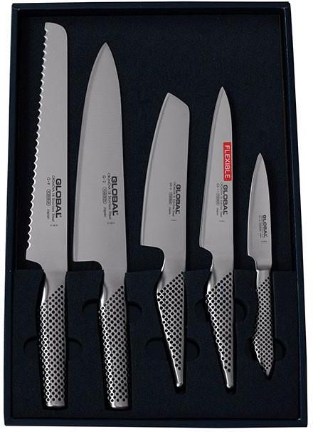 Zestaw 5 Noży kuchennych Global | G-2951138Praktyczny zestaw noży Global stanowi znakomity fundament indywidualnej kolekcji kuchennej, świetnie wypełni każdą kuchnie zapewniając wszystkie potrzebne noże do codziennej pracy.W skład kompletu wchodzi:- Nóż szefa kuchni 20 cm (G-2)- Nóż do pieczywa 22 cm (G-9)- Nóż do warzyw 14 cm (GS-5)- Nóż uniwersalny elastyczny 15 cm (GS-11)- Nóż do obierania 9 cm (GS-38)