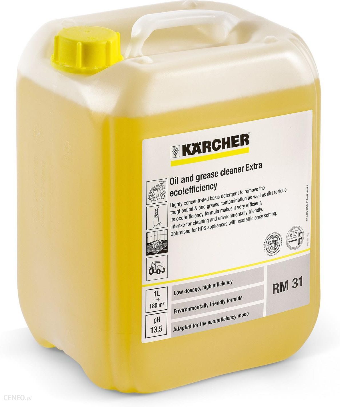 Silnie zasadowy (pH: 13.5 w koncentracie) preparat z linii eco!efficiency do wysokociśnieniowego mycia zasadniczego w branży przemysłowej i warsztatach. Usuwa silne zabrudzenia olejowe i mineralne, smary, żywice i smołę. Dzięki udoskonalonej formule jego zużycie w stosunku do tradycyjnego RM 31 ASF zmniejsza się nawet o 25%. RM 31 ASF przeznaczony jest do stosowania z urządzeniami wysokociśnieniowymi HDS oraz ze spryskiwaczami wstępnymi. Przygotowanie: 1+3 Dozowanie: 0.75-4% Dozowanie ( w trybie eco!efficiency): 1-5%