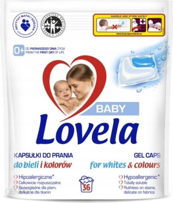 LOVELA BABY Kapsułki do prania białych i kolorowych tkanin, ubranek i pieluszek dziecięcych 36 szt. Zalety produktu: Hipoalergiczne* i delikatne od pierwszego dnia życia do prania bieli i kolorów testowane klinicznie przebadane dermatologicznie pozytywna opinia Instytutu Matki i Dziecka bezwzględne dla plam nie zawierają wybielaczy optycznychOpakowanie: 36 sztLovela Baby to hipoalergiczne kapsułki do prania białych i kolorowych ubranek. Ich formuła jest delikatna i przetestowana dermatologicznie. Są wyjątkowo łatwe w użyciu oraz doskonałe do prania pieluszek i bielizny dziecięcej. Kapsułki Lovela Baby zostały przebadane klinicznie i posiada pozytywną opinię Instytutu Matki i Dziecka.Ich skład opracowany został specjalnie z myślą o nawet bardzo wrażliwej skórze, pozostawiają delikatny i neutralny zapach.0+ oznacza, że można je stosować już od pierwszego dnia życia dziecka.Nie zawierają wybielaczy optycznych. Zadbaliśmy, by były bezpieczne dla wrażliwej skóry dziecka.Kapsułki są idealne do prania białych i kolorowych tkanin dziecięcych, a także do ubrań osób dorosłych z wrażliwą skórą, skłonnościami do alergii oraz z AZS (atopowym zapaleniem skóry).‘’Skóra niemowląt i małych dzieci jest bardzo delikatna i łatwo ulega podrażnieniom. Dlatego polecam rodzicom środki do prania, które są bezpieczne dla maluszka już od pierwszego dnia życia i posiadają hipoalergiczną formułę. Rekomenduję używanie hipoalergicznych produktów do 3. roku życia dziecka, a także do prania ubrań całej rodziny.” dr Lidia Ruszkowska lekarz medycyny, specjalista dermatologDlaczego właśnie kapsułki Lovela Baby? Hipoalergiczna skład opracowany specjalnie z myślą o nawet bardzo wrażliwej skórze numer 1 w Polsce** testowane klinicznie bezpieczny nawet dla noworodków już od pierwszego dnia życia przebadane dermatologicznie od 0 do 3 roku życia całkowicie rozpuszczalne bezwzględne dla plam delikatne dla tkanin delikatny, neutralny zapach przeznaczone do prania w pralkach automatycznychW czym prać ubranka niemowlaka?Jako Mama masz wiele wyborów przed sobą. Nie musisz dodatkowo zastanawiać się jaki środek do prania dla dzieci wybrać. Tworząc produkty Lovela pamiętaliśmy o tym, że będą przeznaczone dla kogoś, kto jest całym Twoim światem. Możesz je stosować od pierwszych dni życia bez obaw o stan wrażliwej, niemowlęcej skóry. Zawierają jedynie niealergizujące substancje, aby Twój maluszek miał poczucie najwyższego komfortu. Delikatny zapach sprawia, że Ty i Twoje dziecko będziecie chcieli wtulać się w uprane ubranka.Jak i w czym prać dziecięce ubranka?1. Żeby zapewnić swojemu dziecku optymalną ochronę należy wiedzieć, że jego skóra rozwija się przez pierwsze 3 lata życia i w porównaniu do skóry dorosłego jest aż 5 razy cieńsza oraz bardziej podatna na działanie czynników zewnętrznych.2. Pamiętaj, że dziecięce ubranka powinny zostać uprane również przed pierwszym założeniem, nawet jeżeli były fabrycznie zafoliowane przez producenta. Od momentu produkcji do zakupu przechodzą przez ręce wielu osób, które zostawiają niewidoczne gołym okiem drobnoustroje i zanieczyszczenia. 3. Pranie ubranek dziecięcych w zbyt wysokich temperaturach może zaszkodzić delikatnym tkaninom. Nastawiaj pranie na maksymalnie 40ºC ewentualnie wybierając opcję dodatkowego płukania. Środek dedykowany do prania ciuszków niemowlęcych poradzi sobie z zabrudzeniami nie niszcząc ubranek.4. Jeżeli Twoje dziecko od pierwszych dni przejawia skłonności alergiczne możesz uprać w Loveli również swoją pościel i ubrania. Maleństwo ma z nimi kontakt zawsze gdy je nosisz lub przytulasz.Sprawdź pozostałe produkty Lovela na naszych aukcjach. Zamów i zapłać za przesyłkę tylko raz! Stosowanie:Lovela BABY Kapsułki do prania białych i kolorowych tkanin, ubranek i pieluszek dziecięcych. To łatwe! Umieść jedną kapsułkę w komorze pralki razem z rzeczami do prania i uruchom pralkę.Szczegóły na opakowaniu. Uwaga. Działa drażniąco na oczy. Działa drażniąco na skórę. Działa szkodliwie na organizmy wodne, powodując długotrwałe skutki. CHRONIĆ PRZED DZIECMI. W razie konieczności zasięgnięcia porady lekarza, należy pokazać pojemnik lub etykietę. Dokładnie umyć ręce po użyciu. Przechowywać wyłącznie w oryginalnym opakowaniu. W PRZYPADKU DOSTANIA SIĘ DO OCZU: Ostrożnie płukać wodą przez kilka minut. Wyjąć soczewki kontaktowe, jeżeli są i można je łatwo usunąć. Nadal płukać. Natychmiast skontaktować się z OŚRODKIEM ZATRUĆ/lekarzem. W PRZYPADKU POŁKNIĘCIA: Natychmiast skontaktować się z OŚRODKIEM ZATRUĆ/lekarzem. NIE wywoływać wymiotów. Zawartość/pojemnik usuwać do odpowiednio oznakowanych kontenerów zgodnie z lokalnymi, regionalnymi, krajowymi i międzynarodowymi przepisami. Nie przekłuwać, nie rozrywać, nie przecinać. Jeśli dziecko włoży kapsułkę do ust, natychmiast ją usunąć i nie wywoływać wymiotów. Używać wyłącznie suchymi rękami.Skład (Więcej informacji o składnikach: www.rbeuroinfo.com): 15% -30%: niejonowe środki powierzchniowo czynne, anionowe środki powierzchniowo czynne. 5% – 15%: Mydło. <5%:fosfoniany, enzymy, kompozycja zapachowa, Benzisothiazolinone*Hipoalergiczne, tj. o zmniejszonym potencjale alergizującym.