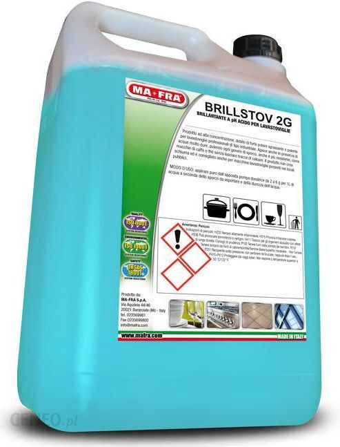 BRILLSTOV 2GŚrodek do płukania zmywarek z kwasowym pH – twarda woda pH 2,5.BRILLSTOV 2G to środek o kwasowym pH odpowiednie dla przemysłowych jak i domowych zmywarek, BRILLSTOV 2G zapobiega kropelkowaniu wody i zmętnianiu talerzy, nie zostawiając żadnych smug spowodowanych solami mineralnymi zawartymi w wodzie, zapewniając przy tym czystość i szybkie schnięcie talerzy, nawet w bardzo twardej wodzie.Instrukcja obsługi:Wypełnij komorę nabłyszczacza w zmywarce, zgodnie z zaleceniami instrukcji obsługi zmywarki, sprawdzaj regularnie poziom płynu. Dla przemysłowych zmywarek używaj produktu nierozcieńczonego, za pomocą pompki dozującej. Dozuj: 0,2 – 0,5 g na litr wody.ZAWIERA: 15 – 30% niejonowego środka powierzchniowo czynnego.Surfaktanty użyte w tej forumule są zgodne z przepisami związanych z detergentami, dotyczących biodegradacji ustalone rozporządzeniem nr 648/2004.DO PROFESJONALNEGO UŻYTKU OSTRZEŻENIA:H315 Wywołuje podrażnienia skóry.H319 Wywołuje poważne podrażnienia oczu.ŚRODKI OSTROŻNOŚCI:P280 Należy używać odzieży ochronnej/rękawiczek ochronnych/okularów ochronnych/ochrony twarzyP305+P351+P338 Jeśli dojdzie do kontaktu z oczami, ostrożnie płukać oczy przez kilka minut, jeśli nosi się soczewki, należy je zdjąć jeśli jest taka możliwość i kontynuować płukanie oczu.P337 + P313 Jeśli podrażnienie oczu nie ustaje, udać się na konsultację do lekarza.P302+P352 Jeśli dojdzie do kontaktu ze skórą, wymyć sporą ilością mydła i wody.