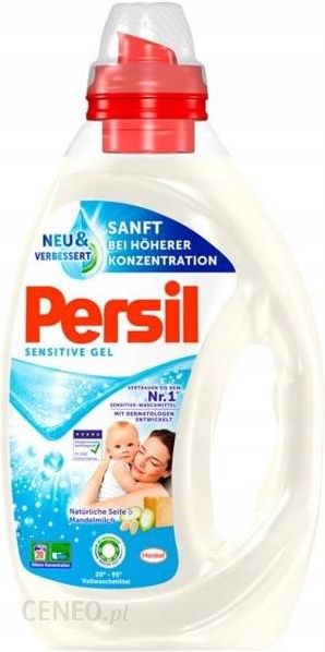 Żel Sensitive Persil łączy najlepszą czystość Persil z najlepszą tolerancją skóry. Persil Sensitive wykonany z naturalnego mydła i mleka migdałowego zapewnia przyjemne uczucie na skórze dzięki delikatnemu myciu tkanin.Wskazówka: Zaleca się pranie odzieży dla niemowląt i małych dzieci, w szczególności przed pierwszym użyciem w najwyższej dopuszczalnej temperaturze, aby usunąć chemikalia i zanieczyszczenia z tkanin.Dawkowanie: Zawsze sprawdzaj instrukcje dotyczące dawkowania na opakowaniu. Dozowanie zależy od wielkości pralki, twardości wody i stopnia zabrudzenia prania. Użyj pół nakrętki płynnego detergentu do średnio zabrudzonego i całej do mocno zabrudzonego prania.