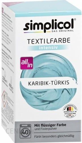 Simplicol Intensiv Barwnik Do Tkanin 560g Karaibski Turkus to innowacyjny barwnik w płynie do stosowania w pralce. Szybko i w prosty sposób nada Twoim ubraniom i tkaninom intensywne kolory. Wystarczy włożyć ubranie do pralki, dodać barwnik a po skończonym cyklu prania otrzymujesz żywy kolor, którym możesz się cieszyć przez długi czas. Barwnik jest w 100% bezpieczny dla pralki.