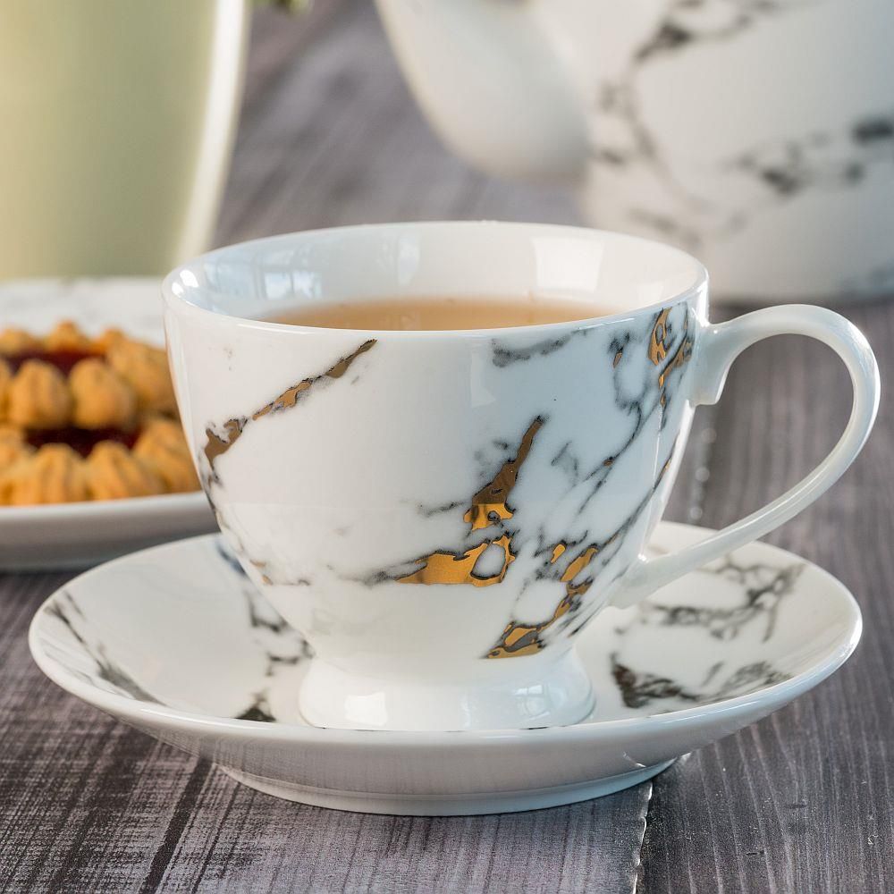 Serwis kawowy i do herbaty dla 6 osób – MARMO GoldKolekcję Marmo Gold wyróżnia marmurkowy wzór, ożywiony muśnięciami złota. Naczynia wykonane są z porcelany typu „new bone china” w ciepłym, mlecznym odcieniu bieli. Serwis do kawy i herbaty Marmo Gold jest połączeniem klasycznej elegancji z nowoczesnością. Na uwagę zasługują doskonale zaprojektowane filiżanki oraz oryginalny dzbanek z bambusowym uchwytem. Kolekcja Marmo Gold obejmuje naczynia do kawy, herbaty i deserów. Kubki i filiżanki występują w trzech różnych pojemnościach. Biel porcelany w połączeniu z jasnoszarym, marmurowym wzorem wspaniale prezentuje się w klasycznych i w nowoczesnych wnętrzach. Świetnie sprawdzi się zarówno na kawowych spotkaniach z przyjaciółmi, jak i w codziennym użytkowaniu.Porcelana odpowiednia do okazjonalnego mycia w zmywarce, w temperaturze poniżej 50°C, z użyciem łagodnych środków myjących (zalecamy żele do zmywarek).Skład zestawu kawowego dla 6 osób:dzbanek do herbaty – pojemność 800 ml6 filiżanek ze spodkiem – pojemność 220 ml6 talerzyków deserowych – średnica 20 cm