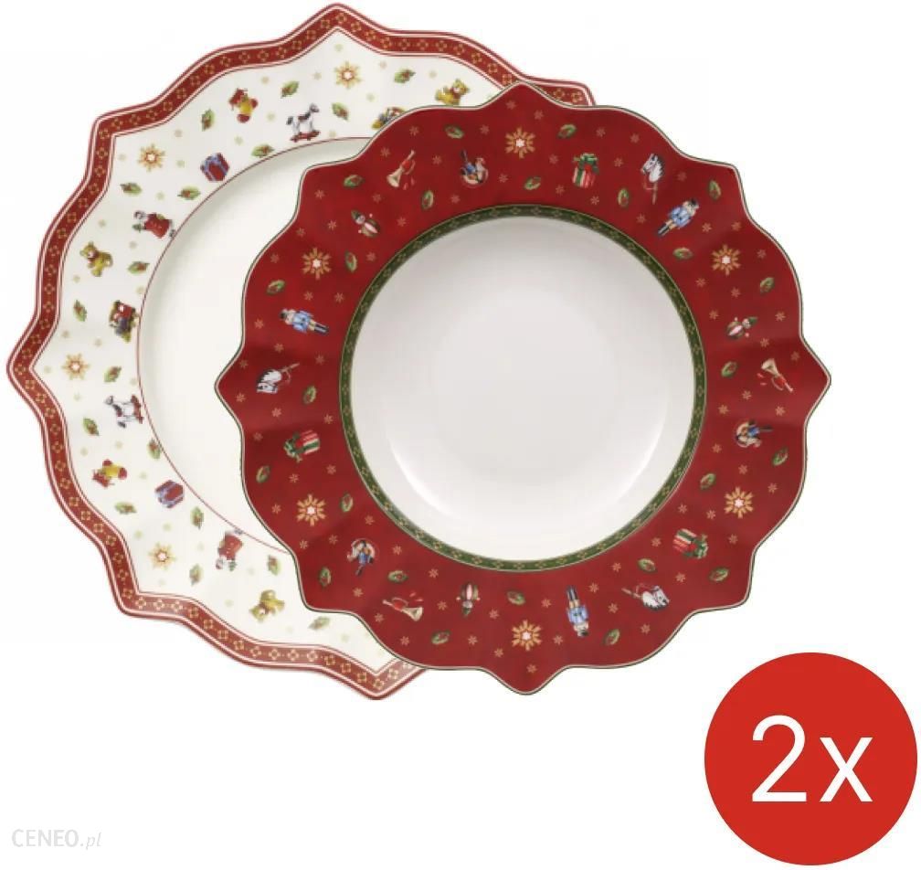 Zastawa utrzymana w tradycyjnych barwach: czerwonym, białym oraz zielonym kolorze pozwoli wprowadzić na każdy stół nostalgiczną atmosferę, dzięki której celebrowanie Świąt Bożego Narodzenia nabierze wyjątkowego charakteru. Zaleca się ręczne mycie produktu. W skład zestawu wchodzi: Talerz Toys Delight 29cm obiadowy Okrągły talerz Toy’s Delight marki Villeroy&Boch o średnicy 29cm sprawdzi się idealnie do serwowania świątecznych posiłków. Kolorowy talerz z oryginalną krawędzią zdobią świąteczne motywy tj. Święty Mikołaj, choinka, koń na biegunach, dziadek do orzechów czy wreszcie kolorowe pierniczki. Talerz Toys Delight 26cm biały głęboki Głęboki talerz Toy’s Delight marki Villeroy&Boch o średnicy 26cm sprawdzi się idealnie do serwowania tradycyjnych, świątecznych zup – czerwonego barszczu z uszkami czy aromatycznej zupy grzybowej. Talerz z ozdobnym brzegiem zdobią świąteczne motywy tj. Święty Mikołaj, choinka, koń na biegunach, dziadek do orzechów czy wreszcie kolorowe pierniczki.